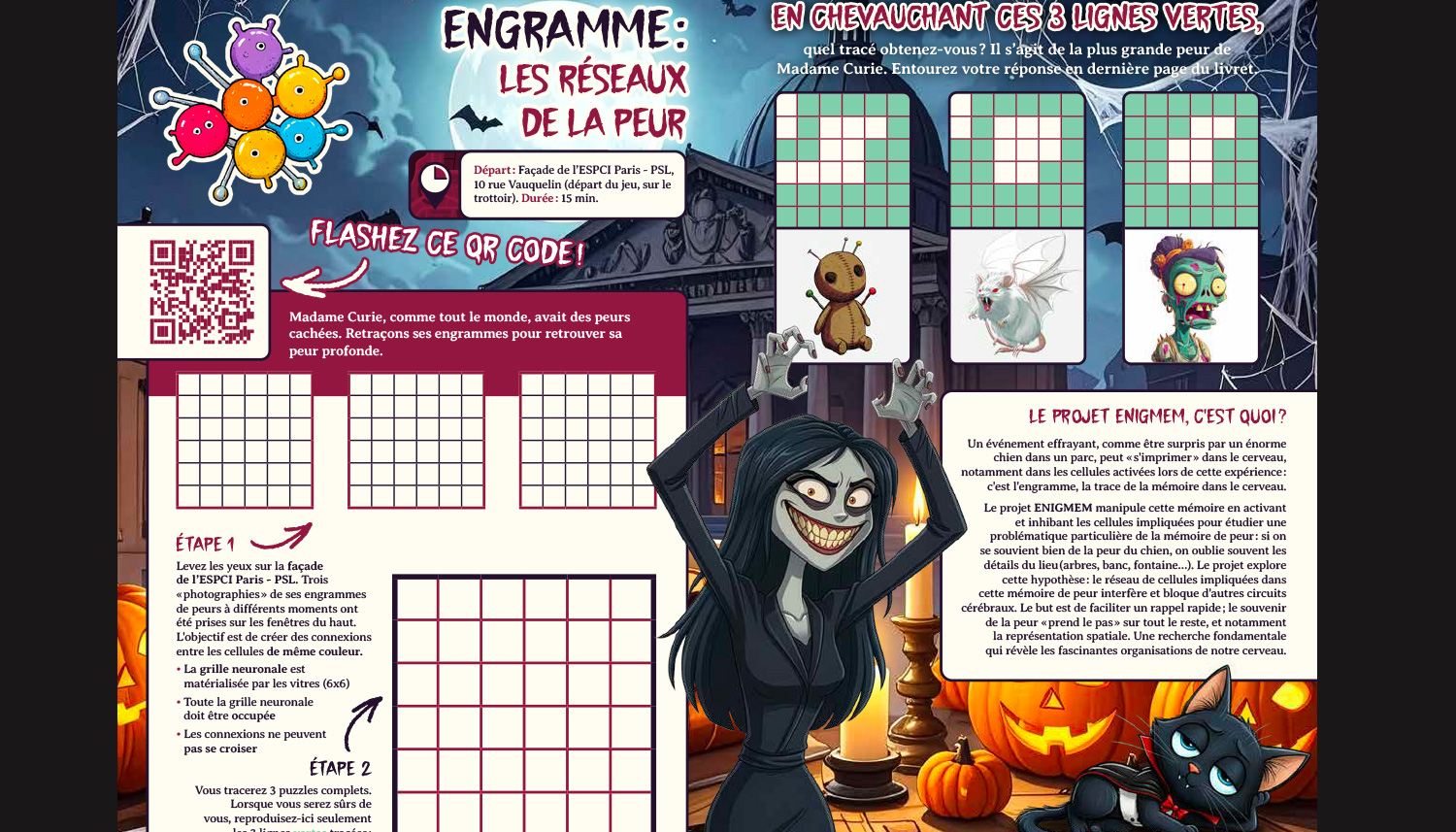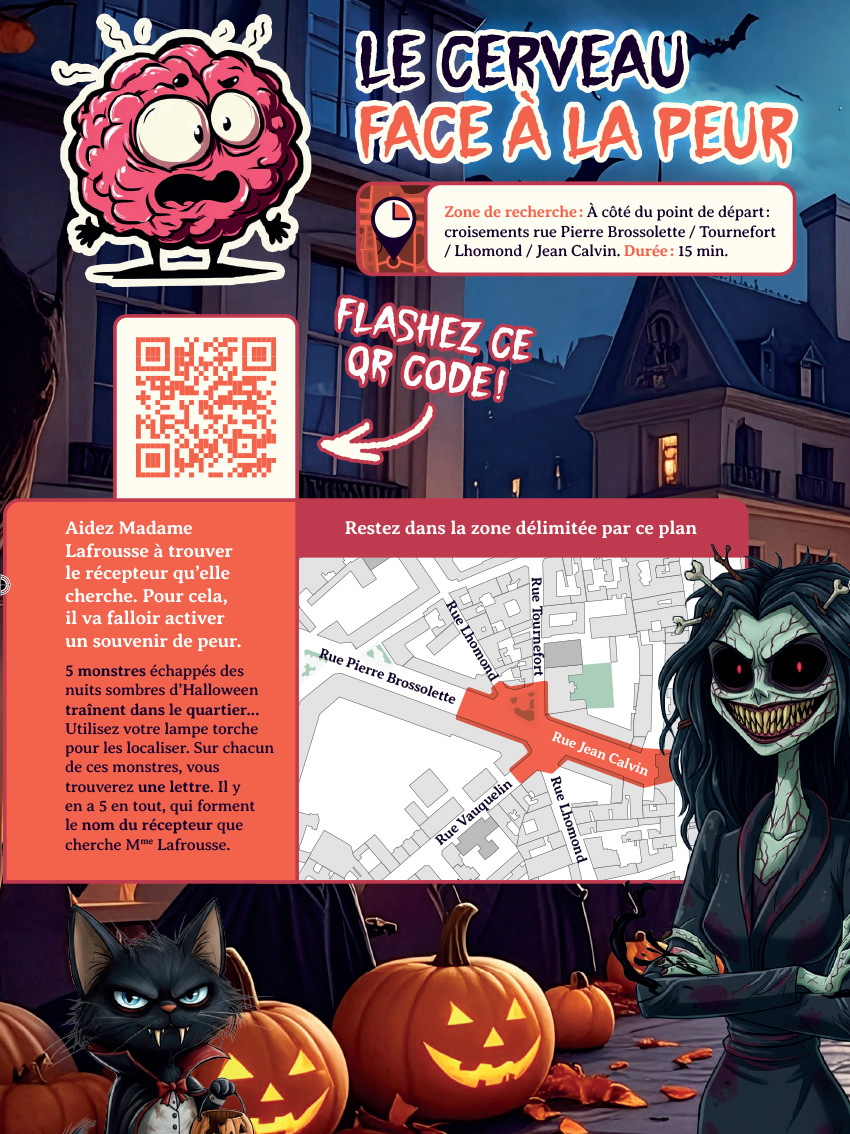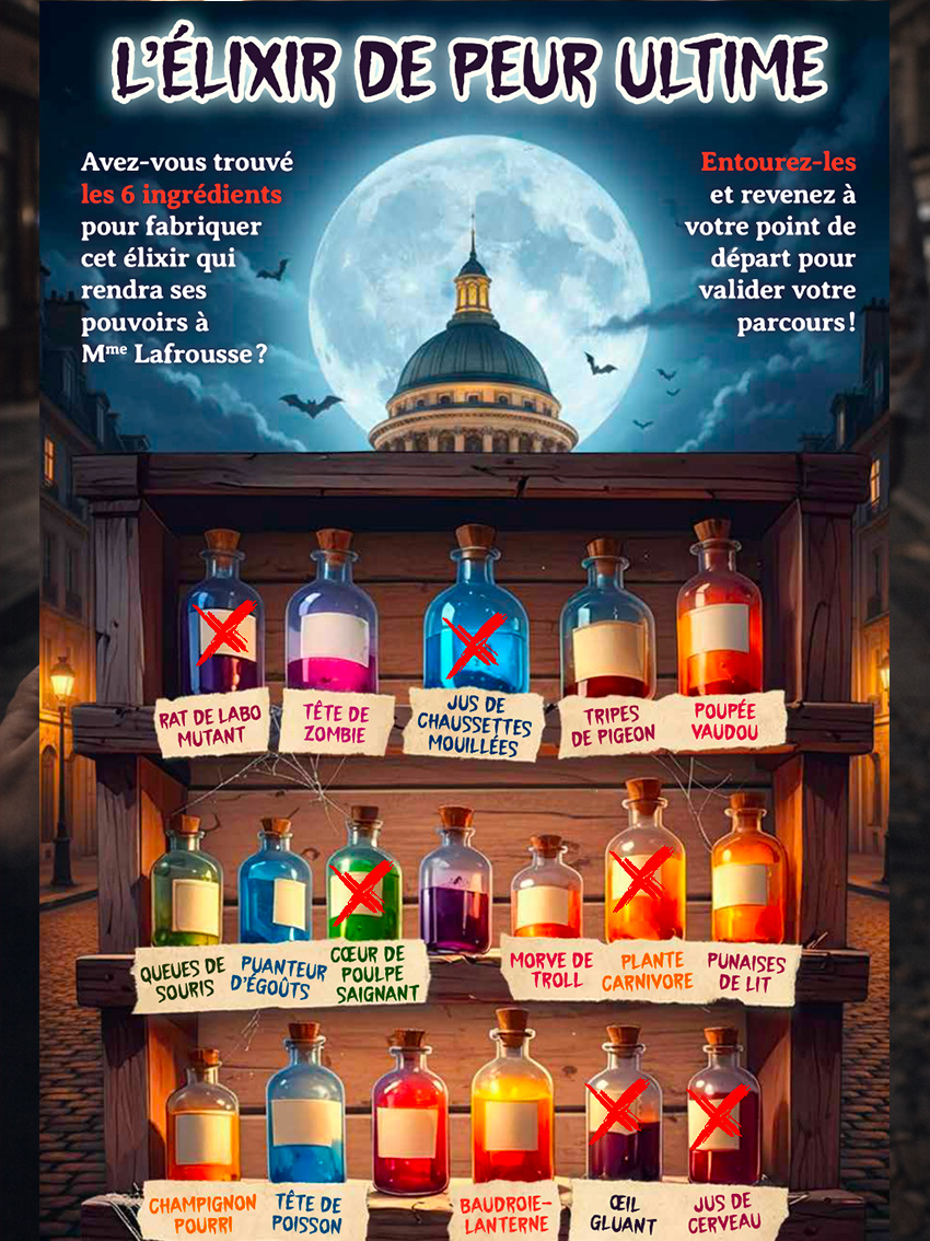 Madame LaFrousse est en détresse : en cette nuit d’Halloween, elle ne fait plus peur à personne. Une catastrophe ! Pour réactiver l’effroi, elle confie aux participants une mission cruciale : retrouver les recettes de l’Élixir de Peur Ultime. Cœur de poule saignant, œil gluant, plante carnivore… Chaque ingrédient est lié à une énigme et cache une vérité scientifique sur les mécanismes de la peur.